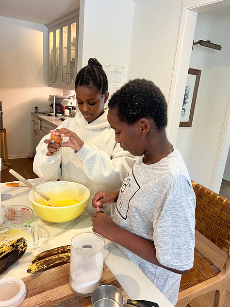 Bake together. We made banana chocolate chip muffins, but any baking project works!